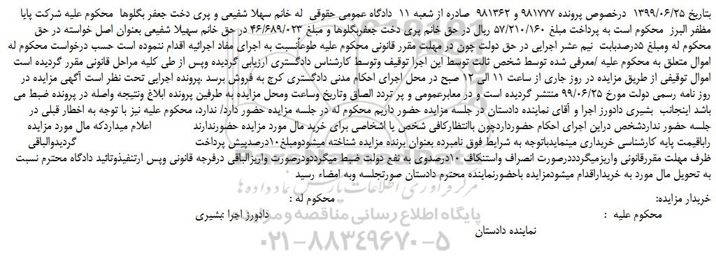 بتاریخ 1399/06/25 درخصوص پرونده 981777 و 981362 صادره از شعبه 11 دادگاه عمومی حقوقی له خانم سهلا شفیعی و پری دخت جعفر بگلوها محکوم علیه شرکت پایا مظفر البرز محکوم است به پرداخت مبلغ 57/210/160 ریال در حق خانم پری دخت جعفربگلوها و مبلغ 46/689/023 در حق خانم سهیلا شفیعی بعنوان اصل خواسته در حق محکوم له ومبلغ 5درصدبابت نیم عشر اجرایی در حق دولت چون در مهلت مقرر قانونی محکوم علیه طوعاًنسبت به اجرای مفاد اجرائیه اقدام ننموده است حسب درخواست محکوم له اموال متعلق به محکوم علیه /معرفی شده توسط شخص ثالث توسط این اجرا توقیف وتوسط کارشناس دادگستری ارزیابی گردیده وپس از طی کلیه مراحل قانونی مقرر گردیده است اموال توقیفی از طریق مزایده در روز جاری از ساعت 11 الی 12 صبح در محل اجرای احکام مدنی دادگستری کرج به فروش برسد .پرونده اجرایی تحت نظر است آگهی مزایده در روز نامه رسمی دولت مورخ 99/06/25 منتشر گردیده است و در معابرعمومی و پر تردد الصاق وتاریخ وساعت ومحل مزایده به طرفین پرونده ابلاغ ونتیجه واصله در پرونده ضبط می باشد اینجانب بشیری دادورز اجرا و آقای نماینده دادستان در جلسه مزایده حضور داریم محکوم له در جلسه مزایده حضور دارد/ ندارد، محکوم علیه نیز با توجه به اخطار قبلی در جلسه حضور نداردشخص دراین اجرای احکام حضورداردچون باانتظارکافی شخص یا اشخاصی برای خرید مال مورد مزایده حضورندارند اعلام میداردکه مال مورد مزایده راباقیمت پایه کارشناسی خریداری مینمایدباتوجه به شرایط فوق نامبرده بعنوان برنده مزایده شناخته میشودومبلغ10درصدپیش پرداخت گردیدوالباقی ظرف مهلت مقررقانونی واریزمیگردددرصورت انصراف واستنکاف 10درصدوی به نفع دولت ضبط میگرددودرصورت واریزالباقی درفرجه قانونی وپس ارتنفیذوتائید دادگاه محترم نسبت به تحویل مال مورد به خریداراقدام میشودمزایده باحضورنماینده محترم دادستان صورتجلسه وبه امضاء رسید
