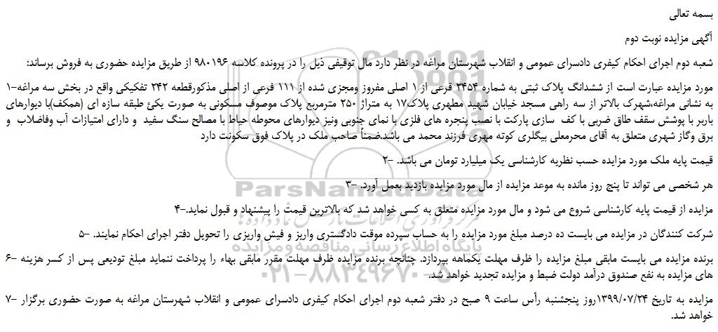 7- مزایده به تاریخ 1399/07/24روز پنجشنبه رأس ساعت 9 صبح در دفتر شعبه دوم اجرای احکام کیفری دادسرای عمومی و انقلاب شهرستان مراغه به صورت حضوری برگزار خواهد شد.