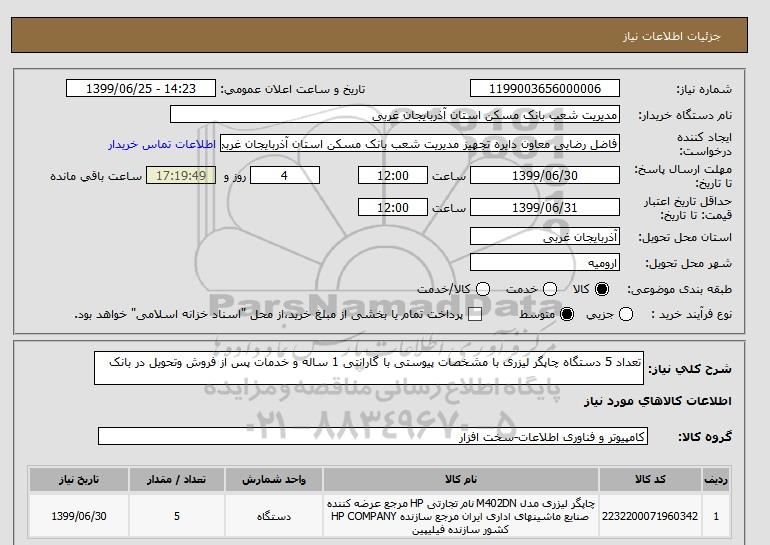 شرح کلی نیاز: تعداد 5 دستگاه چاپگر لیزری با مشخصات پیوستی با گارانتی 1 ساله و خدمات پس از فروش وتحویل در بانک