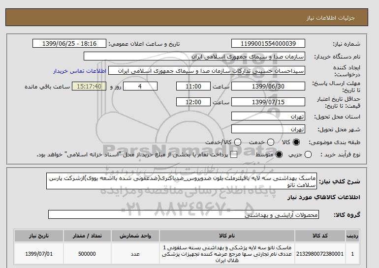 شرح کلی نیاز: ماسک بهداشتی سه لایه بافیلترملت بلون ضدویروس_ضدباکتری(ضدعفونی شده بااشعه یووی)ازشرکت پارس سلامت نانو