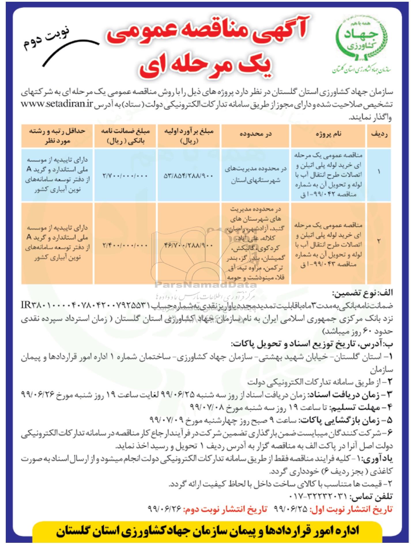 سازمان جهاد کشاورزی استان گلستان در نظر دارد پروژه های ذیل را با روش مناقصه عمومی یک مرحلهای به شرکت های تشخیص صلاحیت شده و دارای مجوز از طریق سامانه تدارکات الکترونیکی دولت ستاد واگذار نماید