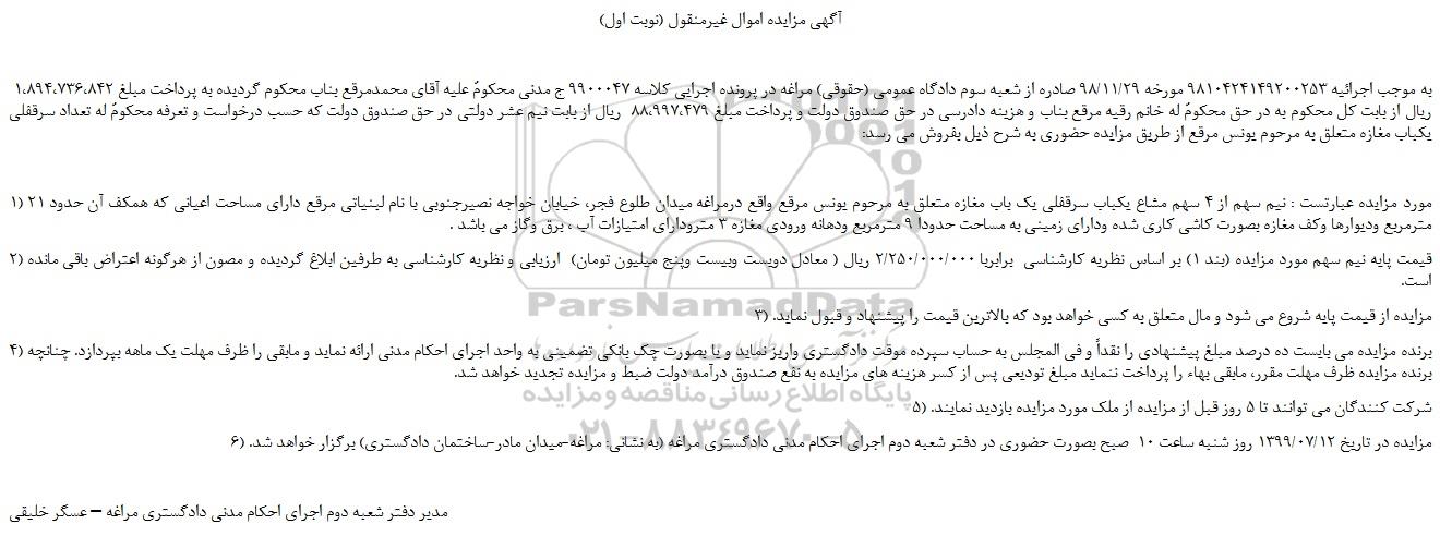 به موجب اجرائیه 9810424149200253 مورخه 98/11/29 صادره از شعبه سوم دادگاه عمومی (حقوقی) مراغه در پرونده اجرایی کلاسه 9900047 ج مدنی محکومٌ علیه آقای محمدمرقع بناب محکوم گردیده به پرداخت مبلغ 1،894،736،842 ریال از بابت کل محکوم به در حق محکومٌ له خانم رقیه مرقع بناب و هزینه دادرسی در حق صندوق دولت و پرداخت مبلغ 88،997،479 ریال از بابت نیم عشر دولتی در حق صندوق دولت که حسب درخواست و تعرفه محکومٌ له تعداد سرقفلی یکباب مغازه متعلق به مرحوم یونس مرقع از طریق مزایده حضوری به شرح ذیل بفروش می رسد: