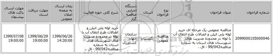 | 2099000105000046 | مناقصه عمومی یک مرحله ای خرید لوله پلی اتیلن و اتصالات طرح انتقال آب با لوله در محدوده مدیریت های شهرستان های استان به شماره مناقصه99/042 - اق . | مناقصه عمومی | گلستان | سازمان جهاد کشاورزی | خرید لوله پلی اتیلن و اتصالات طرح انتقال آب با لوله در محدوده مدیریت های شهرستان های استان به شماره مناقصه99/042 - اق . | 1399/06/26 14:30:00 | 1399/06/29 19:00:00 | 1399/07/08 19:00:00 |