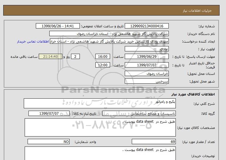 نام دستگاه خریدار:شرکت پالایش گاز شهید هاشمی نژاد - استان خراسان رضوی