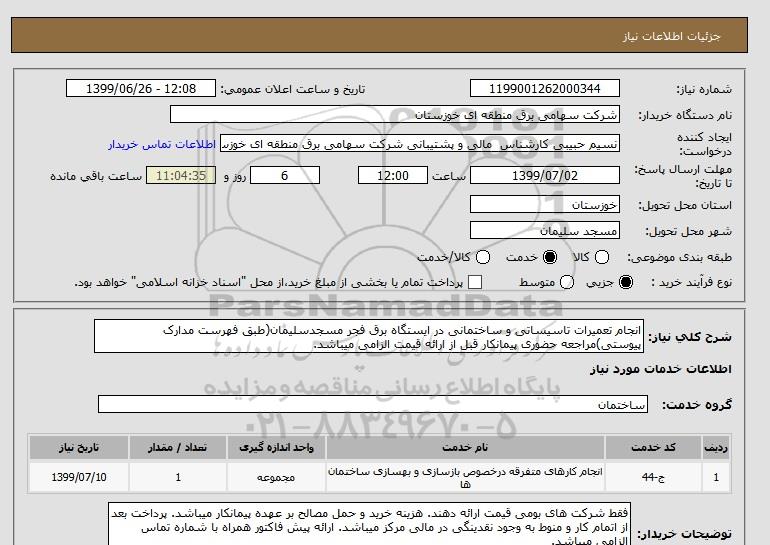 استعلام انجام تعمیرات تاسیساتی و ساختمانی در ایستگاه برق فجر مسجدسلیمان(طبق فهرست مدارک پیوستی)مراجعه حضوری پیمانکار قبل از ارائه قیمت الزامی میباشد., استعلام انجام تعمیرات تاسیساتی و ساختمانی در ایستگاه برق فجر مسجدسلیمان(طبق فهرست مدارک پیوستی)مراجعه حضوری پیمانکار قبل از ارائه قیمت الزامی میباشد.