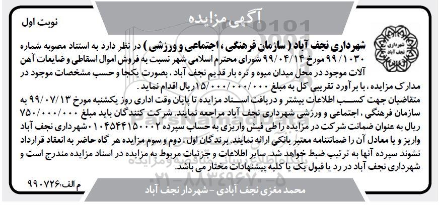 شهرداری نجف آباد (سازمان فرهنگی، اجتماعی و ورزشی) در نظر دارد نسبت به فروش اموال اسقاطی و ضایعات آهن آلات موجود در محل میدان میوه و تره بار قدیم نجف آباد، بصورت یکجا و حسب مشخصات موجود در مدارک مزایده، با برآورد تقریبی کل به مبلغ 15.000.000.000 ریال اقدام نماید