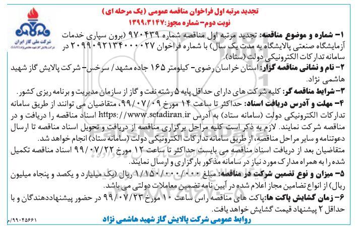 2. نام و نشانی مناقصه گزار: استان خراسان رضوی کیلومتر 165 جاده مشهد/سرخس - شرکت پالایش گاز شهید هاشمی نژاد