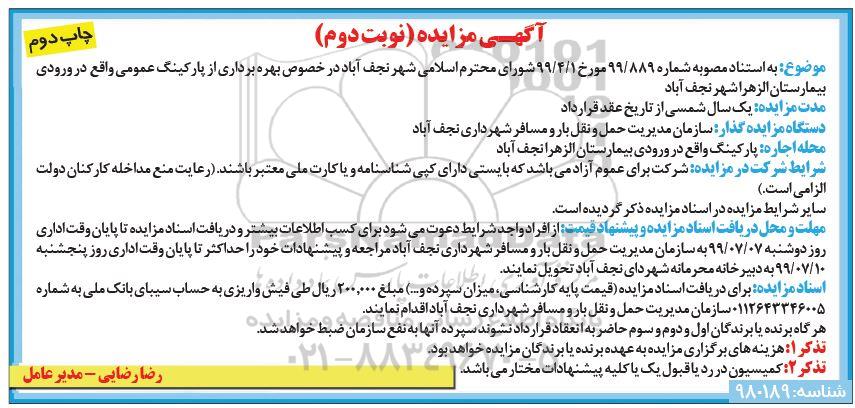 مزایده،مزایده بهره برداری از پارکینگ عمومی - نوبت دوم چاپ دوم