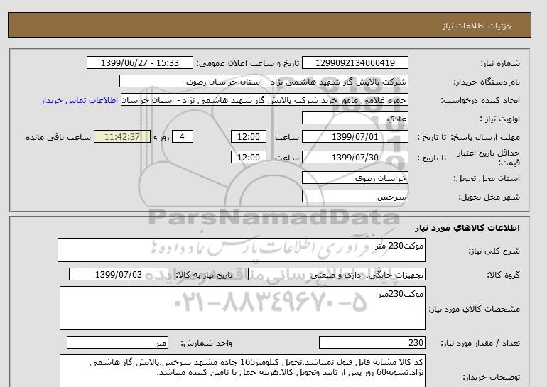 نام دستگاه خریدار:شرکت پالایش گاز شهید هاشمی نژاد - استان خراسان رضوی
