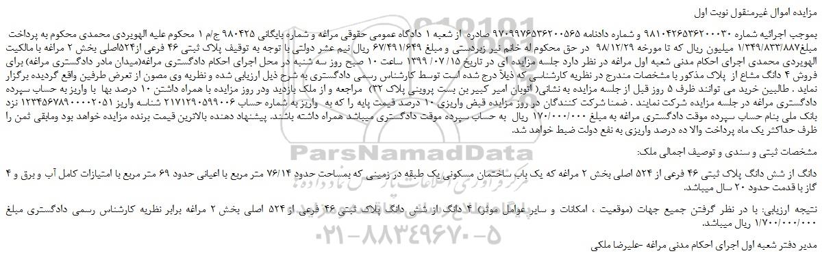 بموجب اجرائیه شماره 9810426536200030 و شماره دادنامه 9709976536200565 صادره از شعبه 1 دادگاه عمومی حقوقی مراغه و شماره بایگانی 980425 ج/م 1 محکوم علیه الهویردی محمدی محکوم به پرداخت مبلغ1/349/833/887 میلیون ریال که تا مورخه 98/12/29 در حق محکوم له خانم نیر زبردستی و مبلغ 67/491/649 ریال نیم عشر دولتی با توجه به توقیف پلاک ثبتی 46 فرعی از524اصلی بخش 2 مراغه با مالکیت الهویردی محمدی اجرای احکام مدنی شعبه اول مراغه در نظر دارد جلسه مزایده ای در تاریخ 15/ 07/ 1399 ساعت 10 صبح روز سه شنبه در محل اجرای احکام دادگستری مراغه(میدان مادر دادگستری مراغه) برای فروش 4 دانگ مشاع از پلاک مذکور با مشخصات مندرج در نظریه کارشناسی که ذیلآ درج شده است توسط کارشناس رسمی دادگستری به شرح ذیل ارزیابی شده و نظریه وی مصون از تعرض طرفین واقع گردیده برگزار نماید . طالبین خرید می توانند ظرف 5 روز قبل از جلسه مزایده به نشانی( اتوبان امیر کبیر بن بست پروینی پلاک 32) مراجعه و از ملک بازدید ودر روز مزایده با همراه داشتن 10 درصد بها با واریز به حساب سپرده دادگستری مراغه در جلسه مزایده شرکت نمایند . ضمنا شرکت کنندگان در روز مزایده قبض واریزی 10 درصد قیمت پایه را که به واریز به شماره حساب 2171290599006 شناسه واریز 12345678900002051 نزد بانک ملی بنام حساب سپرده موقت دادگستری مراغه به مبلغ 170/000/000 ریال به حساب سپرده موقت دادگستری میباشد همراه داشته باشند. پیشنهاد دهنده بالاترین قیمت برنده مزایده خواهد بود ومابقی ثمن را ظرف حداکثر یک ماه پرداخت والا ده درصد واریزی به نفع دولت ضبط خواهد شد.