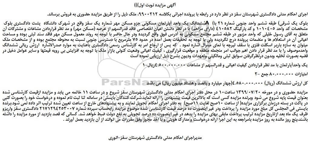 مزایده،مزایده فروش ششدانگ یک واحد آپارتمان مسکونی