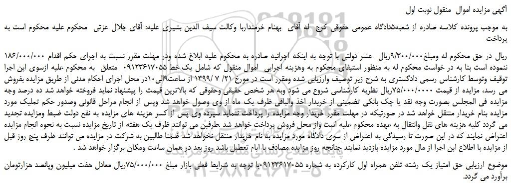 به موجب پرونده کلاسه صادره از شعبه5دادگاه عمومی حقوقی کرج له آقای بهنام خرمنداربا وکالت سیف الدین بشیری علیه: آقای جلال عزتی محکوم علیه محکوم است به پرداخت