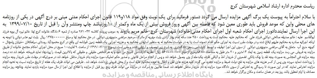 با سلام احتراماً به پیوست یک برگ آگهی مزایده ارسال می گردد دستور فرمائید برای یک نوبت وفق مواد 118و119 قانون اجرای احکام مدنی مبنی بر درج آگهی در یکی از روزنامه های محلی واین که موعد فروش باید طوری معین شود که فاصله بین آگهی وروز فروش بیش از یک ماه وکمتر از 10روزنباشد چاپ ومنتشر وآن را قبل از تاریخ 1399/07/10 به این اجرا ارسال نمایند.دادورز اجرای احکام شعبه اول اجرای احکام مدنی(خانواده) شهرستان کرج-خانم مریم بازوند به موجب پرونده کلاسه 971042 صادره از شعبه 6 دادگاه خانواده کرج لها: خانم نیره آل بویه فرزند ابوالقاسم علیه : خانم صدیقه صالحی دولابی فرزند علی که محکوم علیه محکوم است به پرداخت 250 عدد سکه تمام بهار آزادی بابت مهریه از ماترک مرحوم مرتضی منوچهری دولابی در حق محکوم لها و مبلغ 1375000000 ریال بابت نیم عشر دولتی با توجه به اینکه اجرائیه صادره به محکوم علیهم ابلاغ شده و در مهلت مقرر نسبت به اجرای حکم اقدام ننموده است بنا به در خواست محکوم له به منظور استیفای محکوم به و هزینه اجرایی یک قطعه زمین قولنامه ای واقع در کرج محمودآباد روستای سیاهکلان -خیابان پامچال -کوچه منبع آب متعلق به آقای مرتضی منوچهری دولابی از سوی این اجرا توقیف و توسط کارشناس رسمی دادگستری به شرح زیر توصیف و ارزیابی شده و مقرر است درمورخ 1399/07/10 از ساعت 9 لغایت10 صبح در محل اجرای احکام مجتمع خانواده از طریق مزایده به فروش می رسد مزایده یک قطعه زمین به ابعاد 14متربر و 20 متر طول به مساحت 280مترمربع از مبلغ 5600000000 ریال نظریه کارشناسی شروع می شود و به هر شخص حقیقی و حقوقی که بالاترین قیمت را پیشنهاد نماید فروخته خواهد شد ده درصد وجه مزایده فی المجلس به صورت وجه نقد یا چک بانکی تضمینی از خریدار اخذ و الباقی ظرف یک ماه از وی وصول خواهد شد و پس از انجام مراحل قانونی و صدور حکم تملیک مورد مزایده بنام خریدار منتقل خواهد شد در صورتیکه در مهلت مقرر خریدار وجه مزایده را پرداخت ننماید سپرده وی پس از کسر هزینه های مزایده به نفع دولت ضبط و مزایده تجدید می گردد کلیه هزینه های نقل و انتقال به عهده محکوم علیه است و از محل فروش پرداخت خواهد شد . طرفین می توانند ظرف یک هفته از تاریخ مزایده نسبت به نحوه انجام مزایده اعتراض نمایند که در این صورت تا رسیدگی به اعتراض از سوی دادگاه مورد مزایده به نام خریدار منتقل نخواهد شد ضمنا طالبین به شرکت در مزایده می توانند ظرف پنج روز قبل از مزایده با اطلاع این اجرا از مال مورد مزایده بازدید نمایند چنانچه روز مزایده مصادف با ایام تعطیل باشد روز بعد در همان ساعت و مکان برگزار خواهد شد .