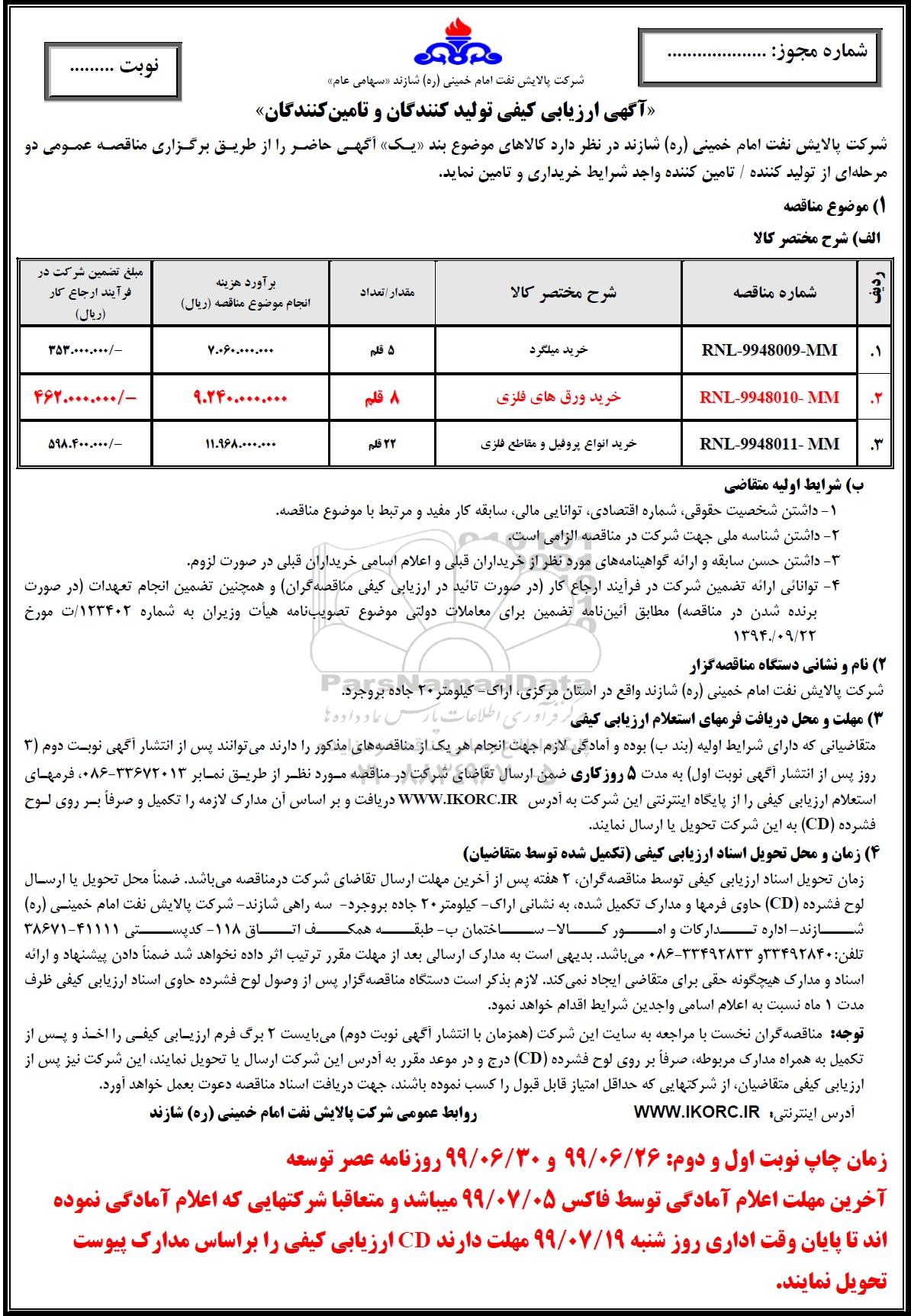 مناقصه خرید میلگرد -99.06.29, اریابی کیفی، ارزیابی کیفی مناقصه خرید میلگرد- 99.06.29