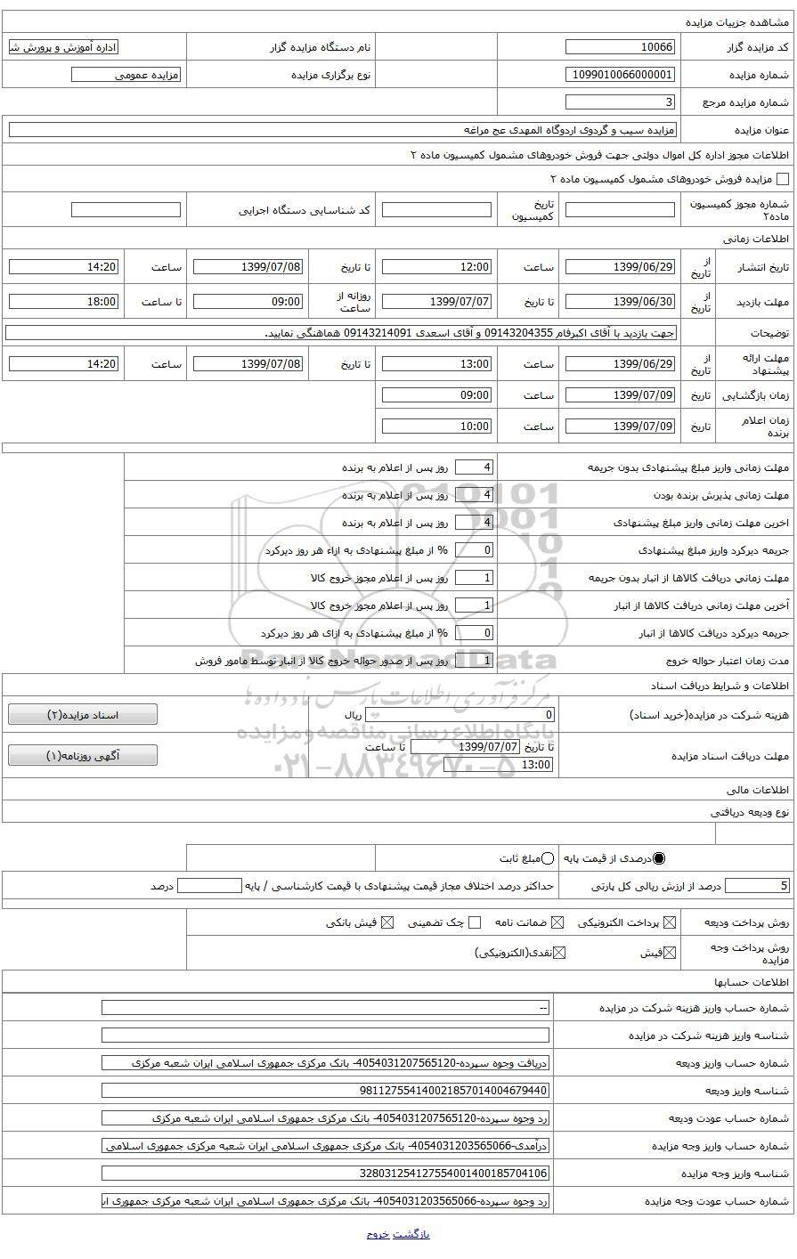 | کد مزایده گزار | 10066 | نام دستگاه مزایده گزار | اداره آموزش و پرورش شهرستان مراغه | |