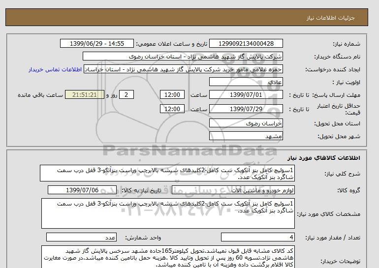 نام دستگاه خریدار:شرکت پالایش گاز شهید هاشمی نژاد - استان خراسان رضوی