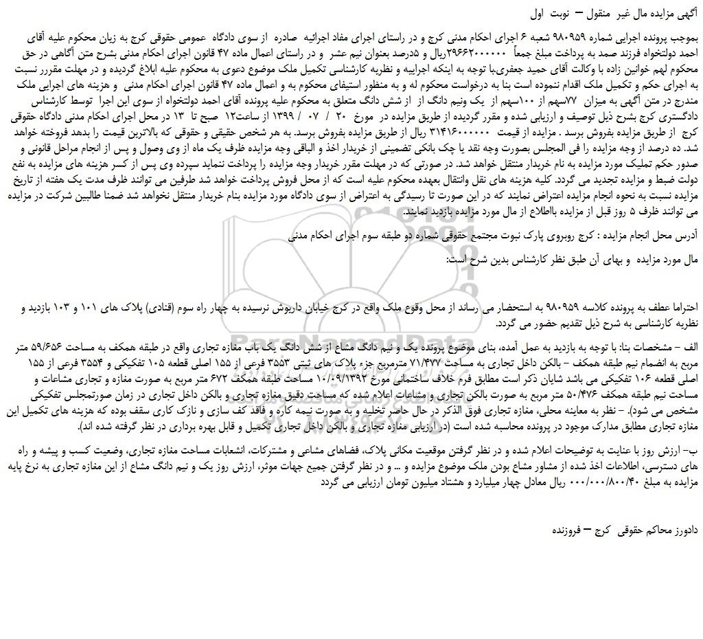 بموجب پرونده اجرایی شماره 980959 شعبه 6 اجرای احکام مدنی کرج و در راستای اجرای مفاد اجرائیه صادره از سوی دادگاه عمومی حقوقی کرج به زیان محکوم علیه آقای احمد دولتخواه فرزند صمد به پرداخت مبلغ جمعاً 29662000000ریال و 5درصد بعنوان نیم عشر و در راستای اعمال ماده 47 قانون اجرای احکام مدنی بشرح متن آگاهی در حق محکوم لهم خوانین زاده با وکالت آقای حمید جعفری.با توجه به اینکه اجراییه و نظریه کارشناسی تکمیل ملک موضوع دعوی به محکوم علیه ابلاغ گردیده و در مهلت مقررر نسبت به اجرای حکم و تکمیل ملک اقدام ننموده است بنا به درخواست محکوم له و به منظور استیفای محکوم به و اعمال ماده 47 قانون اجرای احکام مدنی و هزینه های اجرایی ملک مندرج در متن آگهی به میزان 77سهم از 100سهم از یک ونیم دانگ از از شش دانگ متعلق به محکوم علیه پرونده آقای احمد دولتخواه از سوی این اجرا توسط کارشناس دادگستری کرج بشرح ذیل توصیف و ارزیابی شده و مقرر گردیده از طریق مزایده در مورخ 20 / 07 / 1399 از ساعت12 صبح تا 13 در محل اجرای احکام مدنی دادگاه حقوقی کرج از طریق مزایده بفروش برسد . مزایده از قیمت 31416000000 ریال از طریق مزایده بفروش برسد. به هر شخص حقیقی و حقوقی که بالاترین قیمت را بدهد فروخته خواهد شد. ده درصد از وجه مزایده را فی المجلس بصورت وجه نقد یا چک بانکی تضمینی از خریدار اخذ و الباقی وجه مزایده ظرف یک ماه از وی وصول و پس از انجام مراحل قانونی و صدور حکم تملیک مورد مزایده به نام خریدار منتقل خواهد شد. در صورتی که در مهلت مقرر خریدار وجه مزایده را پرداخت ننماید سپرده وی پس از کسر هزینه های مزایده به نفع دولت ضبط و مزایده تجدید می گردد. کلیه هزینه های نقل وانتقال بعهده محکوم علیه است که از محل فروش پرداخت خواهد شد طرفین می توانند ظرف مدت یک هفته از تاریخ مزایده نسبت به نحوه انجام مزایده اعتراض نمایند که در این صورت تا رسیدگی به اعتراض از سوی دادگاه مورد مزایده بنام خریدار منتقل نخواهد شد ضمنا طالبین شرکت در مزایده می توانند ظرف 5 روز قبل از مزایده بااطلاع از مال مورد مزایده بازدید نمایند.