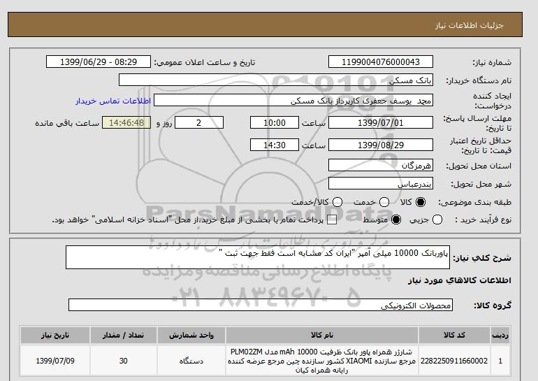 شرح کلی نیاز: پاوربانک 10000 میلی آمپر "ایران کد مشابه است فقط جهت ثبت "