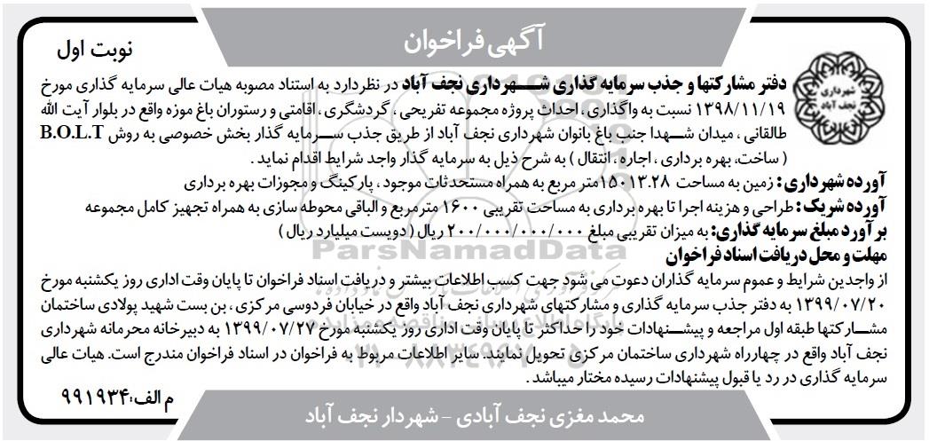 دفتر مشارکتها و جذب سرمایه گذاری شهرداری نجف آباد در نظر دارد نسبت به واگذاری احداث پروژه مجموعه تفریحی ، گردشگری ، اقامتی و رستوران باغ موزه واقع در بلوار ایت اله طالقانی میدان شهدا جنب باغ بانوان شهرداری نجف آباد از طریق جذب سرمایه گذار بخش خصوصی به روش BOLT ساخت بهره برداری اجاره انتقال به شرح ذیل به سرمایه گذار واجد شرایط اقدام نماید