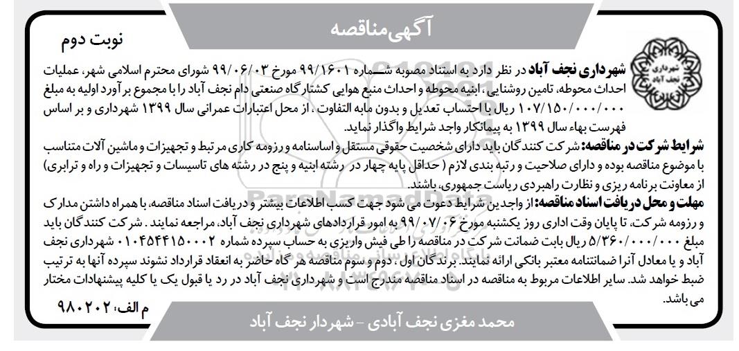 شهرداری نجف آباد در نظر دارد به استناد مصوبه شماره 99/1601 مورخ 99.6.3 شورای محترم اسلامی شهر عملیات احداث محوطه، تامین روشنایی، ابنیه محوطه و احداث منبع هوایی کشتارگاه صنعتی دام نجف آباد را با مجموع براورد اولیه به مبلغ 107.150.000.000 ریال با احتساب تعدیل و بدون مابه التفاوت، از محل اعتبارات عمرانی سال 1399 شهرداری و براساس فهرست بها سال 1399 به پیمانکار واجد شرایط واگذار نماید.