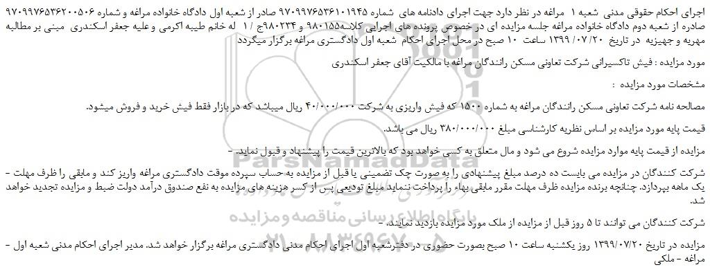 مورد مزایده : فیش تاکسیرانی شرکت تعاونی مسکن رانندگان مراغه با مالکیت آقای جعفر اسکندری