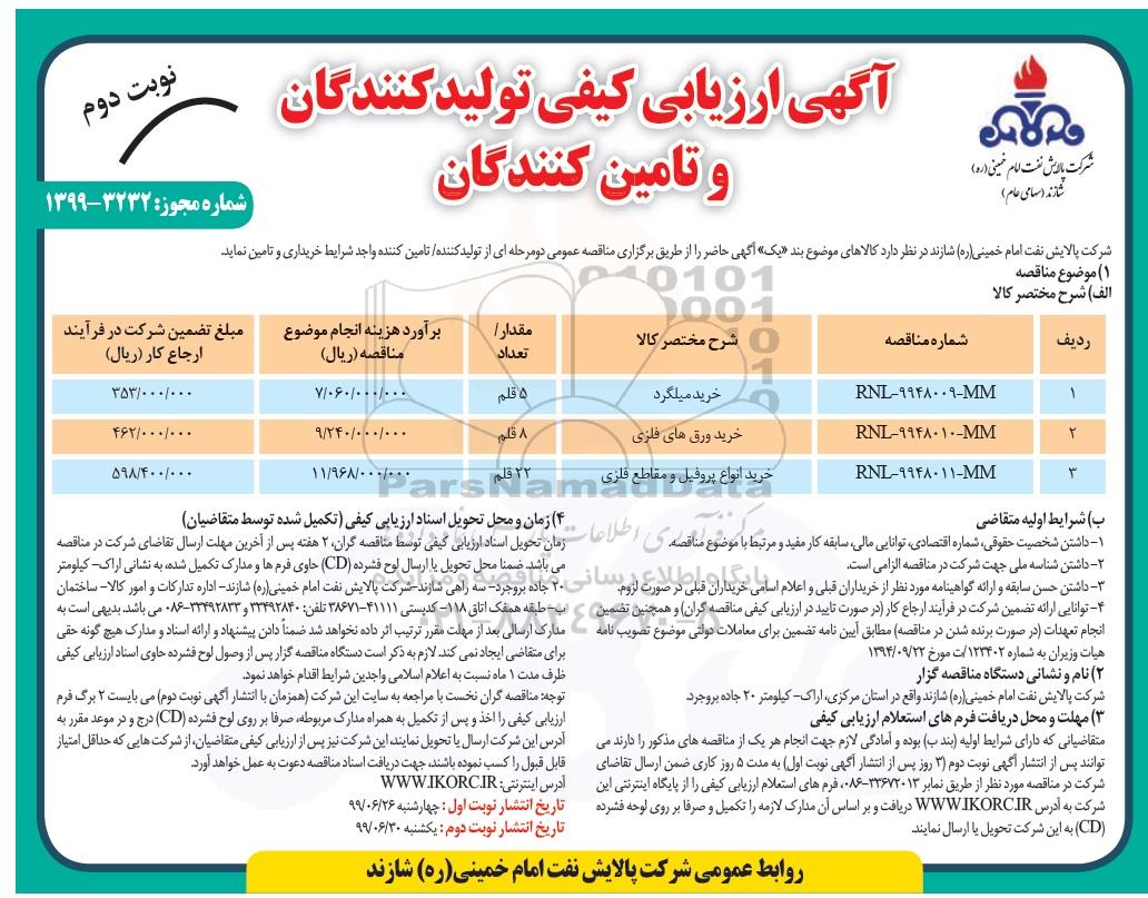مناقصه خرید میلگرد - نوبت دوم , اریابی کیفی، ارزیابی کیفی مناقصه خرید میلگرد- 99.06.29