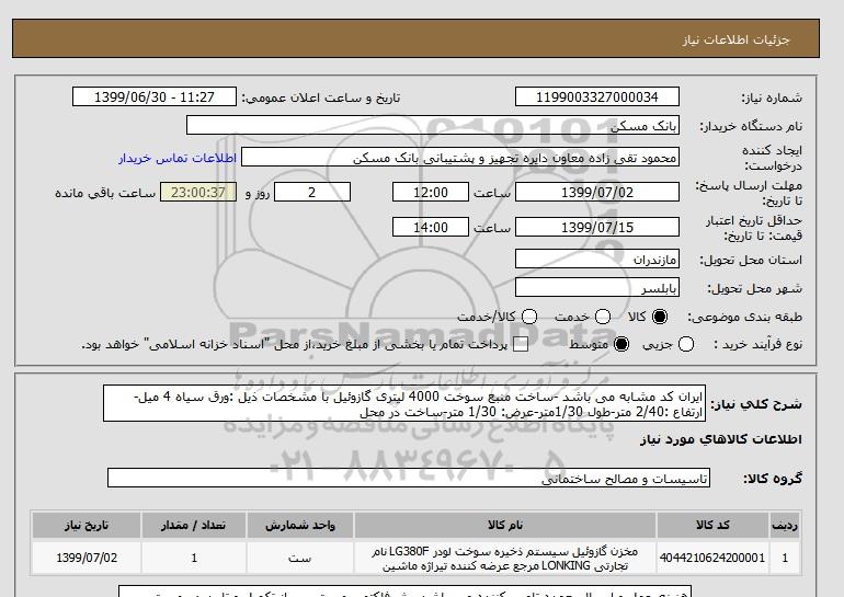 استعلام ایران کد مشابه می باشد -ساخت منبع سوخت 4000 لیتری گازوئیل با مشخصات ذیل :ورق سیاه 4 میل-ارتفاع :2/40 متر-طول 1/30متر-عرض: 1/30 متر-ساخت در محل , استعلام ایران کد مشابه می باشد -ساخت منبع سوخت 4000 لیتری گازوئیل با مشخصات ذیل :ورق سیاه 4 میل-ارتفاع :2/40 متر-طول 1/30متر-عرض: 1/30 متر-ساخت در محل