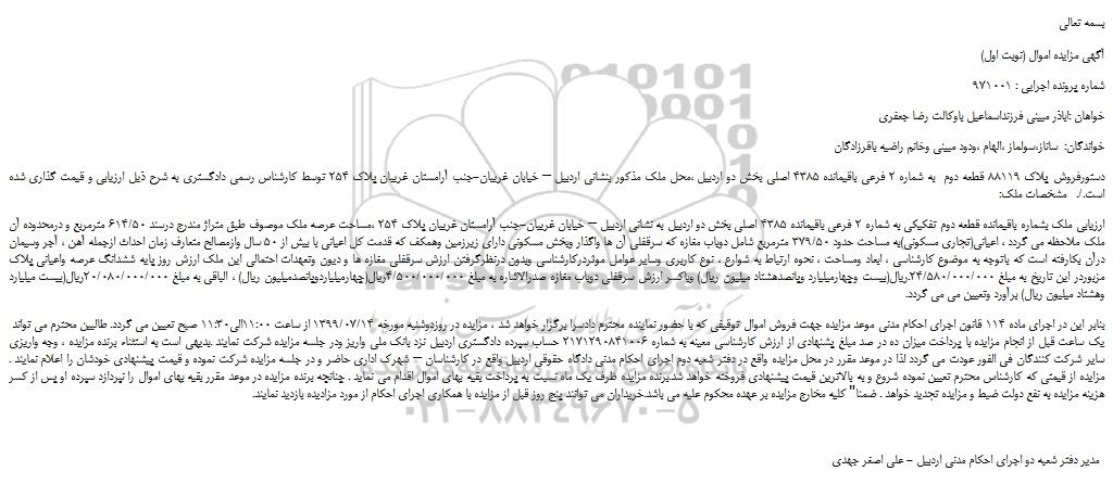 بنابر این در اجرای ماده 114 قانون اجرای احکام مدنی موعد مزایده جهت فروش اموال توقیفی که با حضور نماینده محترم دادسرا برگزار خواهد شد ، مزایده در روزدوشنبه مورخه 1399/07/14 از ساعت 11:00الی11:30 صبح تعیین می گردد. طالبین محترم می تواند یک ساعت قبل از انجام مزایده با پرداخت میزان ده در صد مبلغ پشنهادی از ارزش کارشناسی معینه به شماره 2171290841006 حساب سپرده دادگستری اردبیل نزد بانک ملی واریز ودر جلسه مزایده شرکت نمایند .بدیهی است به استثناء برنده مزایده ، وجه واریزی سایر شرکت کنندگان فی الفور عودت می گردد لذا در موعد مقرر در محل مزایده واقع در دفتر شعبه دوم اجرای احکام مدنی دادگاه حقوقی اردبیل واقع در کارشناسان – شهرک اداری حاضر و در جلسه مزایده شرکت نموده و قیمت پیشنهادی خودشان را اعلام نمایند . مزایده از قیمتی که کارشناس محترم تعیین نموده شروع و به بالاترین قیمت پیشنهادی فروخته خواهد شد.برنده مزایده ظرف یک ماه نسبت به پرداخت بقیه بهای اموال اقدام می نماید . چنانچه برنده مزایده در موعد مقرر بقیه بهای اموال را نپردازد سپرده او پس از کسر هزینه مزایده به نفع دولت ضبط و مزایده تجدید خواهد . ضمنا" کلیه مخارج مزایده بر عهده محکوم علیه می باشد.خریداران می توانند پنج روز قبل از مزایده با همکاری اجرای احکام از مورد مزادیده بازدید نمایند.