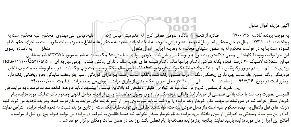 به موجب پرونده کلاسه 9900135 صادره از شعبه 1 دادگاه عمومی حقوقی کرج له خانم میترا عباس زاده علیه:عباس علی مهدوی محکوم علیه محکوم است به پرداخت243/000/000 ریال در حق محکوم له ومبلغ5 درصد عشر دولتی با توجه به اینکه اجرائیه صادره به محکوم علیه ابلاغ شده ودر مهلت مقرر نسبت به اجرای حکم اقدام ننموده است بنا به در خواست محکوم له به منظور استیفای محکوم به وهزینه اجرایی اموال منقول متعلق به نامبرده ازسوی این اجرا توقیف وتوسط کارشناس رسمی دادگستری به شرح زیر توصیف وارزیابی شده خودرو سواری تیبا مدل 95 رنگ سفید به شماره موتور 8332175 شماره شاسی nas8111100G5710565 میزان استعلاک لاستیک 20 درصد خودرو یگانه شرکتی ، تمام چراغها سالم ، تمام شیشه ها ی خودرو سالم ، دارای روکش صندلی چرمی وپارچه ای ، رودری ها سالم سیستم موتور وگیربگس سالم از 25 مرداد درپارکینگ وکیلومترخودرو 121653 باطرس سالم وگلگیر جلو سمت چپ رنگ شده درب جلو وعقب سمت چپ دارای فرورفتگی رنگ ستون جلو سمت چپ دارای ریختگی رنگ ، درب صندوق رنگ شده وگلگیر سمت راست جلو دارای خوردگی ، سپر جلو وعقب سایدگی وفرو ریختگی رنگ دارد .ومقرر است در مورخ 99/7/16 از ساعت 9 الی 10 در محل اجرای احکام مدنی از طریق مزایده بفروش می رسد، مزایده از قیمت 740/000/000 ریال نظریه کارشناسی شروع می شود وبه هر شخص حقیقی وحقوقی که بالاترین قیمت را پیشنهاد نماید فروخته خواهد شد ده درصد وجه مزایده فی المجلس بصورت وجه نقد یا چک بانکی تضمینی از خریدار اخذ والباقی ظرف یک ماه از وی وصول خواهد شد وپس از انجام مراحل قانونی وصدور حکم تملیک مورد مزایده بنام خریدار منتقل خواهد شد در صورتیکه در مهلت مقرر خریدار وجه مزایده را پرداخت ننماید سپرده وی پس از کسر هزینه های مزایده به نفع دولت ضبط ومزایده تجدید می گردد کلیه هزینه های نقل وانتقال به عهده محکوم علیه است واز محل فروش پرداخت خواهد شد .طرفین می توانند ظرف یک هفته از تاریخ مزایده نسبت به نحوه انجام مزایده اعتراض نمایند که در این صورت تا رسیدگی به اعتراض از سوی دادگاه مورد مزایده به نام خریدار منتقل نخواهد شد ضمنا طالبین به شرکت در مزایده می توانند ظرف پنج روز قبل از مزایده با اطلاع این اجرا از مال مورد مزایده بازدید نمایند چنانچه روز مزایده مصادف با ایام تعطیل باشد روز بعد در همان ساعت ومکان برگزار خواهد شد .