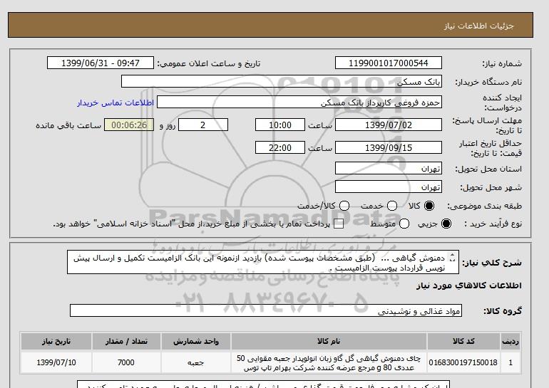 شرح کلی نیاز: دمنوش گیاهی ... (طبق مشخصات پیوست شده) بازدید ازنمونه این بانک الزامیست تکمیل و ارسال پیش نویس قرارداد پیوست الزامیست .