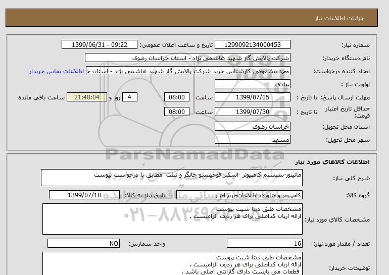 نام دستگاه خریدار:شرکت پالایش گاز شهید هاشمی نژاد - استان خراسان رضوی