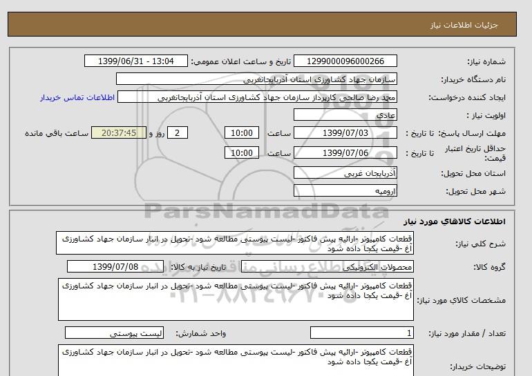 مشخصات کالای مورد نیاز: قطعات کامپیوتر -ارائیه پیش فاکتور -لیست پیوستی مطالعه شود -تحویل در انبار سازمان جهاد کشاورزی آغ -قیمت یکجا داده شود