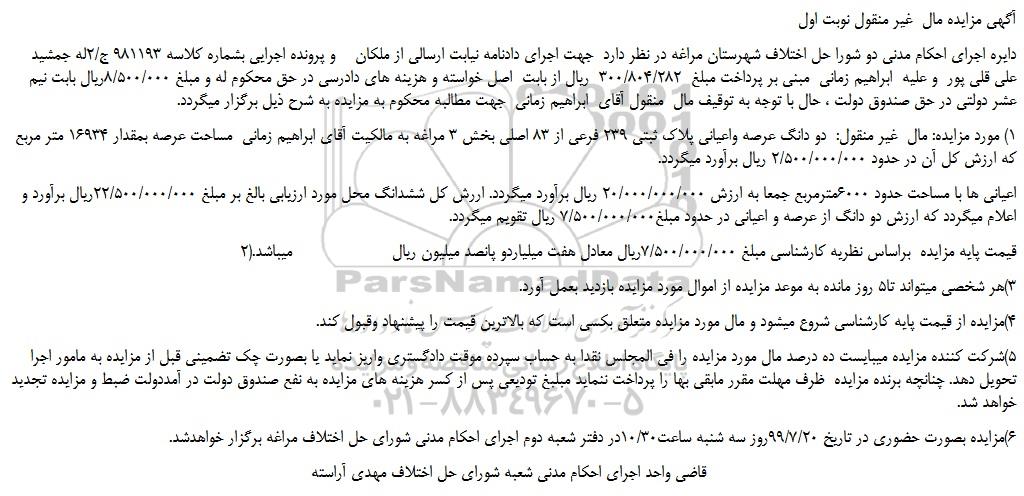 1) مورد مزایده: مال  غیر منقول:  دو دانگ عرصه واعیانی پلاک ثبتی 239 فرعی از 83 اصلی بخش 3 مراغه به مالکیت آقای ابراهیم زمانی  مساحت عرصه بمقدار 16934 متر مربع که ارزش کل آن در حدود 2/500/000/000 ریال برآورد میگردد.