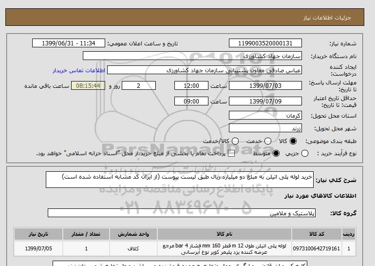 شرح کلی نیاز: خرید لوله پلی اتیلن به مبلغ دو میلیارد ریال طبق لیست پیوست (از ایران کد مشابه استفاده شده است)