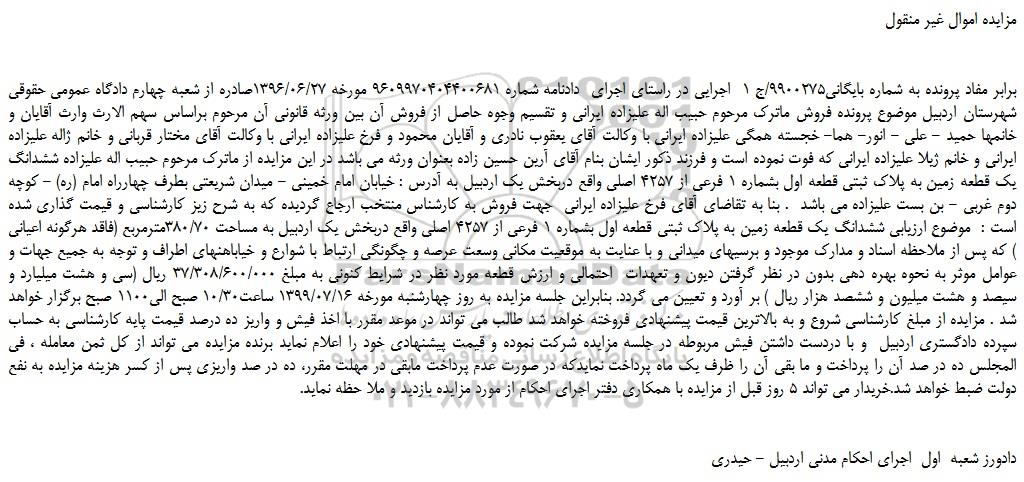 برابر مفاد پرونده به شماره بایگانی9900275/ج 1 اجرایی در راستای اجرای دادنامه شماره 9609970404400681 مورخه 1396/06/27صادره از شعبه چهارم دادگاه عمومی حقوقی شهرستان اردبیل موضوع پرونده فروش ماترک مرحوم حبیب اله علیزاده ایرانی و تقسیم وجوه حاصل از فروش آن بین ورثه قانونی آن مرحوم براساس سهم الارث وارث آقایان و خانمها حمید - علی - انور- هما- خجسته همگی علیزاده ایرانی با وکالت آقای یعقوب نادری و آقایان محمود و فرخ علیزاده ایرانی با وکالت آقای مختار قربانی و خانم ژاله علیزاده ایرانی و خانم ژیلا علیزاده ایرانی که فوت نموده است و فرزند ذکور ایشان بنام آقای آرین حسین زاده بعنوان ورثه می باشد در این مزایده از ماترک مرحوم حبیب اله علیزاده ششدانگ یک قطعه زمین به پلاک ثبتی قطعه اول بشماره 1 فرعی از 4257 اصلی واقع دربخش یک اردبیل به آدرس : خیابان امام خمینی - میدان شریعتی بطرف چهارراه امام (ره) - کوچه دوم غربی - بن بست علیزاده می باشد . بنا به تقاضای آقای فرخ علیزاده ایرانی جهت فروش به کارشناس منتخب ارجاع گردیده که به شرح زیز کارشناسی و قیمت گذاری شده است : موضوع ارزیابی ششدانگ یک قطعه زمین به پلاک ثبتی قطعه اول بشماره 1 فرعی از 4257 اصلی واقع دربخش یک اردبیل به مساحت 380/70مترمربع (فاقد هرگونه اعیانی ) که پس از ملاحظه اسناد و مدارک موجود و برسیهای میدانی و با عنایت به موقعیت مکانی وسعت عرصه و چگونگی ارتباط با شوارع و خیاباهنهای اطراف و توجه به جمیع جهات و عوامل موثر به نحوه بهره دهی بدون در نظر گرفتن دیون و تعهدات احتمالی و ارزش قطعه مورد نظر در شرایط کنونی به مبلغ 37/308/600/000 ریال (سی و هشت میلیارد و سیصد و هشت میلیون و ششصد هزار ریال ) بر آورد و تعیین می گردد. بنابراین جلسه مزایده به روز چهارشنبه مورخه 1399/07/16 ساعت10/30 صبح الی1100 صبح برگزار خواهد شد . مزایده از مبلغ کارشناسی شروع و به بالاترین قیمت پیشنهادی فروخته خواهد شد طالب می تواند در موعد مقرر با اخذ فیش و واریز ده درصد قیمت پایه کارشناسی به حساب سپرده دادگستری اردبیل و با دردست داشتن فیش مربوطه در جلسه مزایده شرکت نموده و قیمت پیشنهادی خود را اعلام نماید برنده مزایده می تواند از کل ثمن معامله ، فی المجلس ده در صد آن را پرداخت و ما بقی آن را ظرف یک ماه پرداخت نمایدکه در صورت عدم پرداخت مابقی در مهلت مقرر، ده در صد واریزی پس از کسر هزینه مزایده به نفع دولت ضبط خواهد شد.خریدار می تواند 5 روز قبل از مزایده با همکاری دفتر اجرای احکام از مورد مزایده بازدید و ملا حظه نماید.