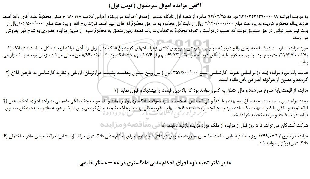 به موجب اجرائیه 9210424149000018 مورخه 92/02/25 صادره از شعبه اول دادگاه عمومی (حقوقی) مراغه در پرونده اجرایی کلاسه 980178 ج مدنی محکومٌ علیه آقای داود آصف فرزند یداله محکوم گردیده به پرداخت مبلغ 2/130/000/000 ریال از بابت کل محکوم به در حق محکومٌ له آقای امید آصف فرزند روح الله و پرداخت مبلغ 106/500/000ریال از بابت نیم عشر دولتی در حق صندوق دولت که حسب درخواست و تعرفه محکومٌ له تعداد یک یک قطعه زمین متعلق به محکومٌ علیه از طریق مزایده حضوری به شرح ذیل بفروش می رسد: