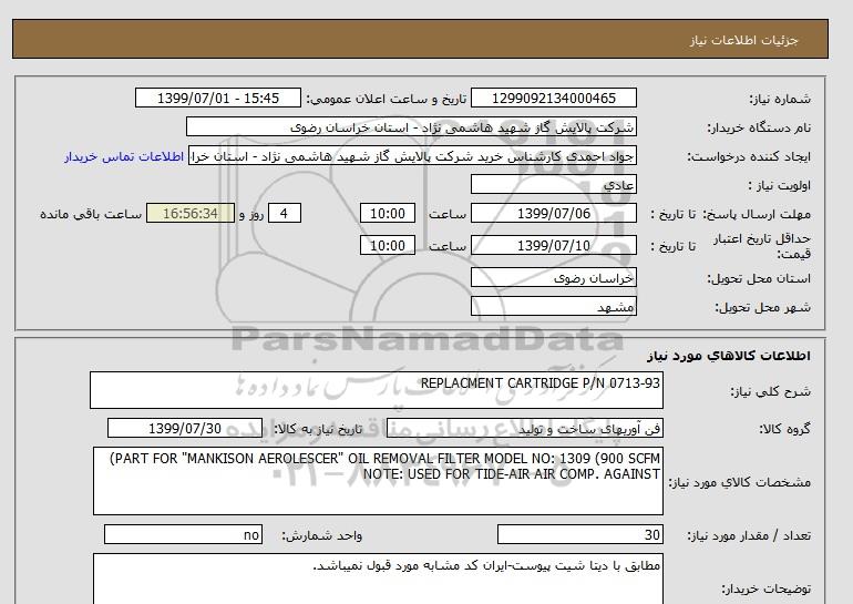 نام دستگاه خریدار:شرکت پالایش گاز شهید هاشمی نژاد - استان خراسان رضوی
