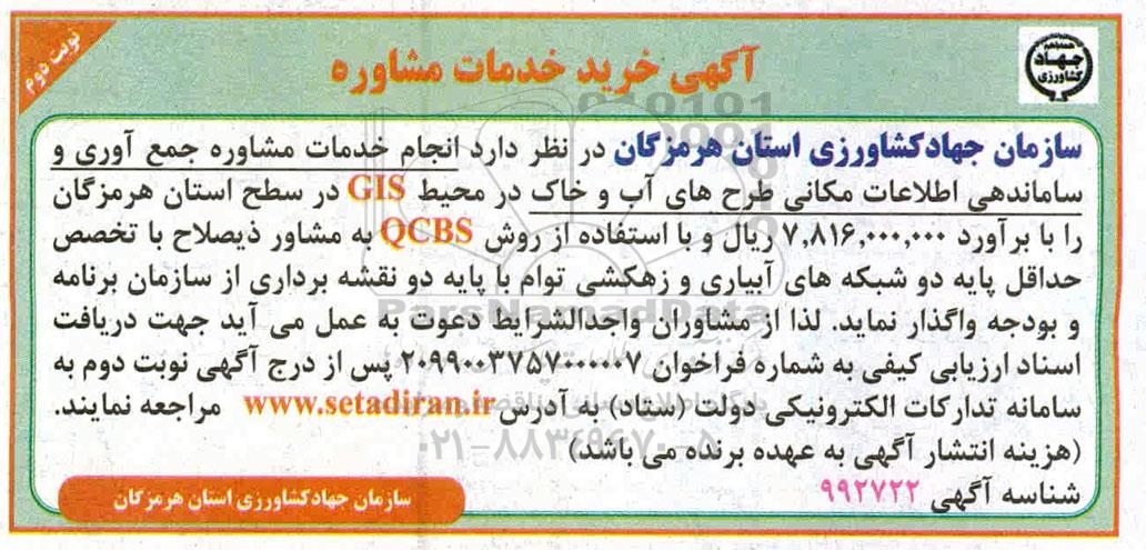 سازمان جهاد کشاورزی استان هرمزگان در نظر دارد انجام خدمات مشاوره جمع آوری و ساماندهی اطلاعات مکانی طرح های آب و خاک در محیط GIS در سطح استان هرمزگان را با برآورد 7.816.000.000 ریال و با استفاده از روش  QCBS به مشاور ذی صلاح با تخصص حداقل پایه دو شبکه های آبیاری و زهکشی توام با پایه دو نقشه برداری از سازمان برنامه و بودجه واگذار نماید. لذا از مشاوران واجدالشرایط دعوت به عمل می آید جهت دریافت اسناد ارزیابی کیفی به شماره فراخوان 2099003757000007 پس از درج آگهی نوبت دوم به سامانه تدارکات الکترونیکی دولت ستاد به آدرس ستاد ایران مراجعه نمایند.