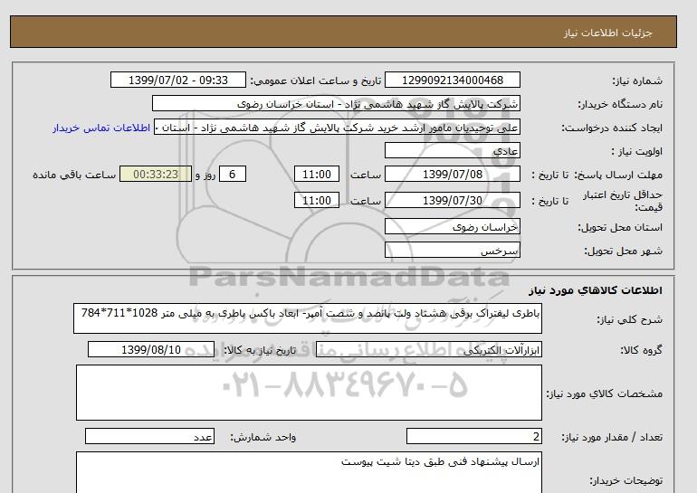 نام دستگاه خریدار:شرکت پالایش گاز شهید هاشمی نژاد - استان خراسان رضوی