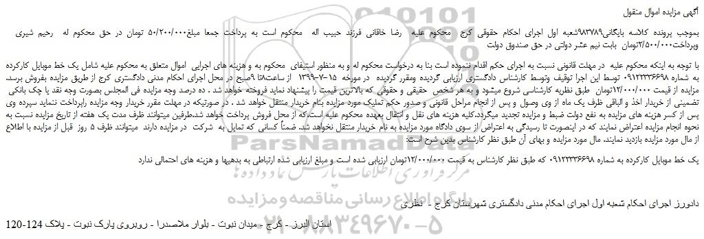 با توجه به اینکه محکوم علیه در مهلت قانونی نسبت به اجرای حکم اقدام ننموده است بنا به درخواست محکوم له و به منظور استیفای محکوم به و هزینه های اجرایی اموال متعلق به محکوم علیه شامل یک خط موبایل کارکرده به شماره 09122336698 توسط این اجرا توقیف وتوسط کارشناس دادگستری ارزیابی گردیده ومقرر گردیده در مورخه 15-7-1399 از ساعت8تا 9صبح در محل اجرای احکام مدنی دادگستری کرج از طریق مزایده بفروش برسد. مزایده از قیمت 12/000/000تومان طبق نظریه کارشناسی شروع میشود و به هر شخص حقیقی و حقوقی که بالاترین قیمت را پیشنهاد نماید فروخته خواهد شد . ده درصد وجه مزایده فی المجلس بصورت وجه نقد یا چک بانکی تضمینی از خریدار اخذ و الباقی ظرف یک ماه از وی وصول و پس از انجام مراحل قانونی و صدور حکم تملیک مورد مزایده بنام خریدار منتقل خواهد شد . در صورتیکه در مهلت مقرر خریدار وجه مزایده راپرداخت ننماید سپرده وی پس از کسر هزینه های مزایده به نفع دولت ضبط و مزایده تجدید میگردد.کلیه هزینه های نقل و انتقال بعهده محکوم علیه است.که از محل فروش پرداخت خواهد شد.طرفین میتوانند ظرف مدت یک هفته از تاریخ مزایده نسبت به نحوه انجام مزایده اعتراض نمایند که در اینصورت تا رسیدگی به اعتراض از سوی دادگاه مورد مزایده به نام خریدار منتقل نخواهد شد. ضمناً کسانی که تمایل به شرکت در مزایده دارند میتوانند ظرف 5 روز قبل از مزایده با اطلاع از مال مورد مزایده بازدید نمایند. مال مورد مزایده و بهای آن طبق نظر کارشناس بدین شرح است: