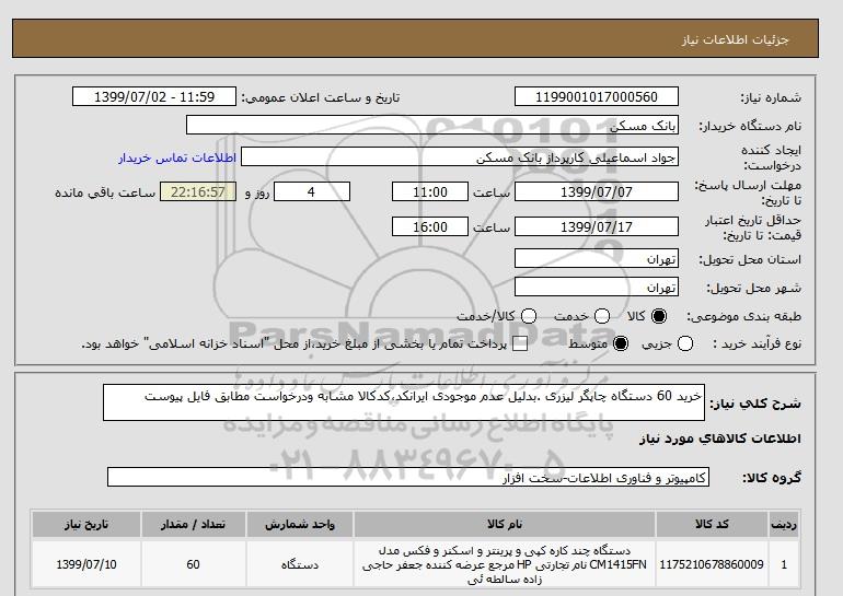 شرح کلی نیاز: خرید 60 دستگاه چاپگر لیزری .بدلیل عدم موجودی ایرانکد،کدکالا مشابه ودرخواست مطابق فایل پیوست