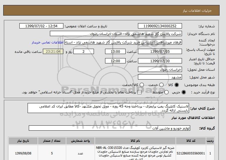 شرح کلی نیاز: لاستیک کاپلینگ پمپ پرایمری - پرداخت وجه 45 روزه - محل تحویل مشهد -کالا مطابق ایران کد اعلامی بایستی ارائه گردد