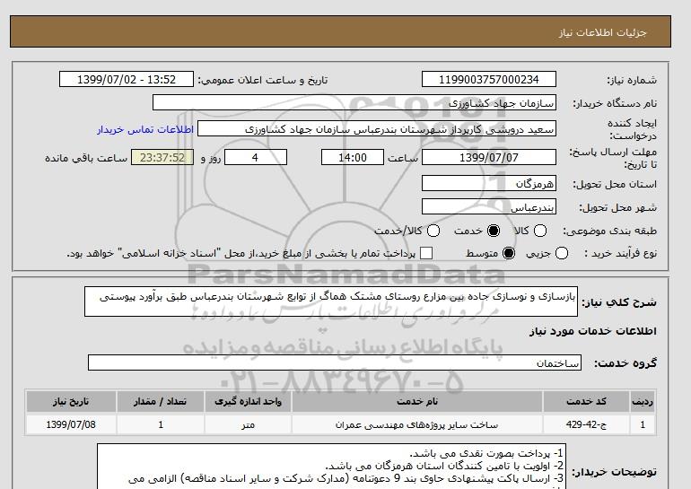 شرح کلی نیاز: بازسازی و نوسازی جاده بین مزارع روستای مشتک هماگ از توابع شهرستان بندرعباس طبق برآورد پیوستی