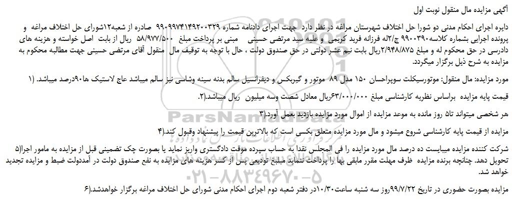 دایره اجرای احکام مدنی دو شورا حل اختلاف شهرستان مراغه در نظر دارد جهت اجرای دادنامه شماره 9909974149200329 صادره از شعبه12شورای حل اختلاف مراغه و پرونده اجرایی بشماره کلاسه9900390 ج/2له فرزانه فرید کریمی و علیه سید مرتضی حسینی مبنی بر پرداخت مبلغ 58/977/500 ریال از بابت اصل خواسته و هزینه های دادرسی در حق محکوم له و مبلغ 2/948/875ریال بابت نیم عشر دولتی در حق صندوق دولت ، حال با توجه به توقیف مال منقول آقای مرتضی حسینی جهت مطالبه محکوم به مزایده به شرح ذیل برگزار میگردد.