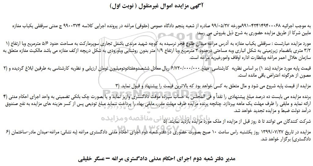 به موجب اجرائیه 9910424149400068مورخه 99/05/27 صادره از شعبه پنجم دادگاه عمومی (حقوقی) مراغه در پرونده اجرایی کلاسه 9900374 ج مدنی سرقفلی یکباب مغازه مابین شرکا از طریق مزایده حضوری به شرح ذیل بفروش می رسد:
