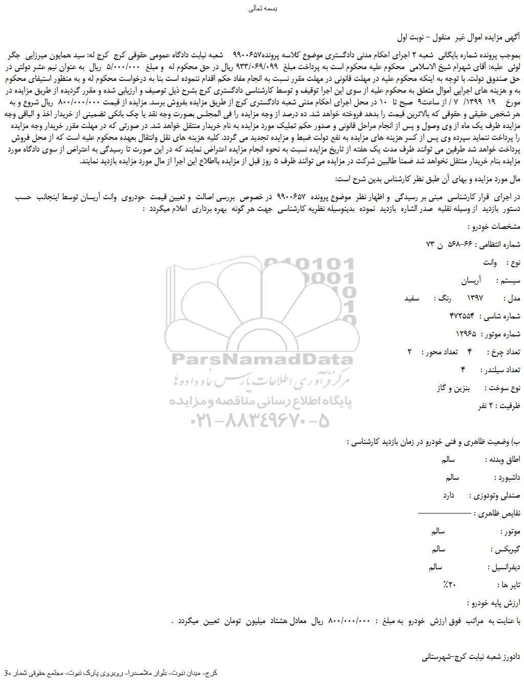 در اجرای قرار کارشناسی مبنی بر رسیدگی و اظهار نظر موضوع پرونده 9900657 در خصوص بررسی اصالت و تعیین قیمت حودروی وانت آریسان توسط اینجانب حسب دستور بازدید از وسیله نقلیه صدر الشاره بازدید نموده بدینوسیله نظریه کارشناسی جهت هر گونه بهره برداری اعلام میگردد :