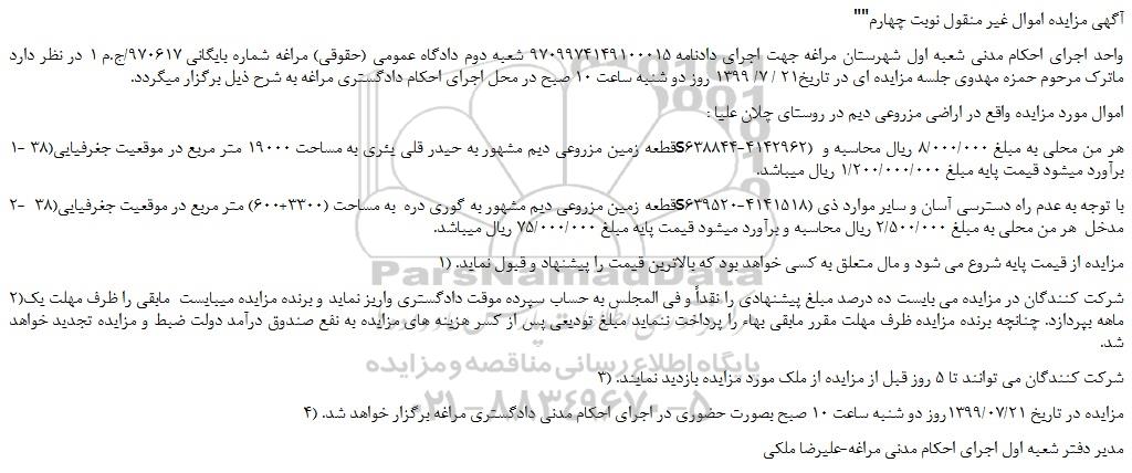 واحد اجرای احکام مدنی شعبه اول شهرستان مراغه جهت اجرای دادنامه 9709974149100015 شعبه دوم دادگاه عمومی (حقوقی) مراغه شماره بایگانی 970617/ج.م 1 در نظر دارد ماترک مرحوم حمزه مهدوی جلسه مزایده ای در تاریخ21 / 7/ 1399 روز دو شنبه ساعت 10 صبح در محل اجرای احکام دادگستری مراغه به شرح ذیل برگزار میگردد.