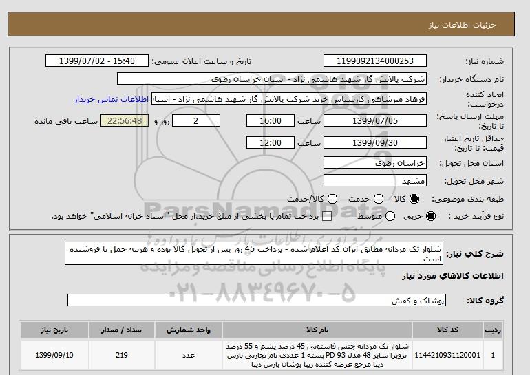 استعلام شلوار تک مردانه مطابق ایران کد اعلام شده - پرداخت 45 روز پس از تحویل کالا بوده و هزینه حمل با فروشنده است, استعلام شلوار تک مردانه مطابق ایران کد اعلام شده - پرداخت 45 روز پس از تحویل کالا بوده و هزینه حمل با فروشنده است