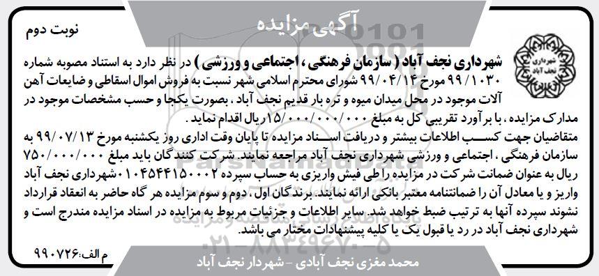 شهرداری نجف آباد (سازمان فرهنگی، اجتماعی و ورزشی) در نظر دارد نسبت به فروش اموال اسقاطی و ضایعات آهن آلات موجود در محل میدان میوه و تره بار قدیم نجف آباد، بصورت یکجا و حسب مشخصات موجود در مدارک مزایده، با برآورد تقریبی کل به مبلغ 15.000.000.000 ریال اقدام نماید