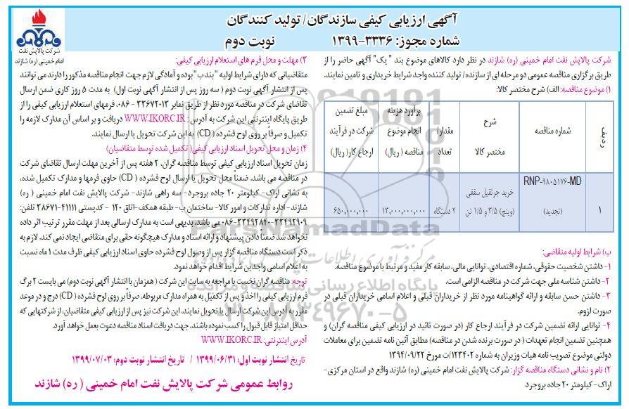 شرکت پالایش نفت امام خمینی (ره) شازند در نظر دارد کالاهای موضوع بند یک آگهی حاضر را از طریق برگزاری مناقصه عمومی دو مرحله ای از سازنده / تولیدکننده واجد شرایط خریداری و تامین نماید.